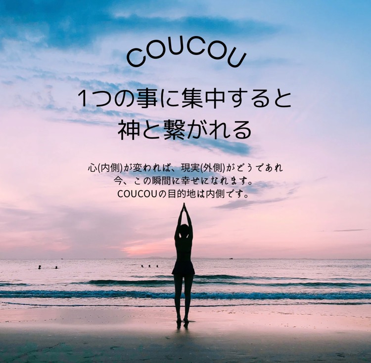 COUCOUはあなたのどんな悩みも、宇宙の仕組みを正しく詳しく言葉でお伝えし、霊能力を使いあなたのさまざまな悩みをスピリチュアル的にもお伝えします。宇宙エネルギーをあなたに下ろして心身の統合を体感して頂きます。また、快適な『あなた』を持続できるように、日々できる肉体と精神的なアプローチの方法を動きと言葉でお伝えします。